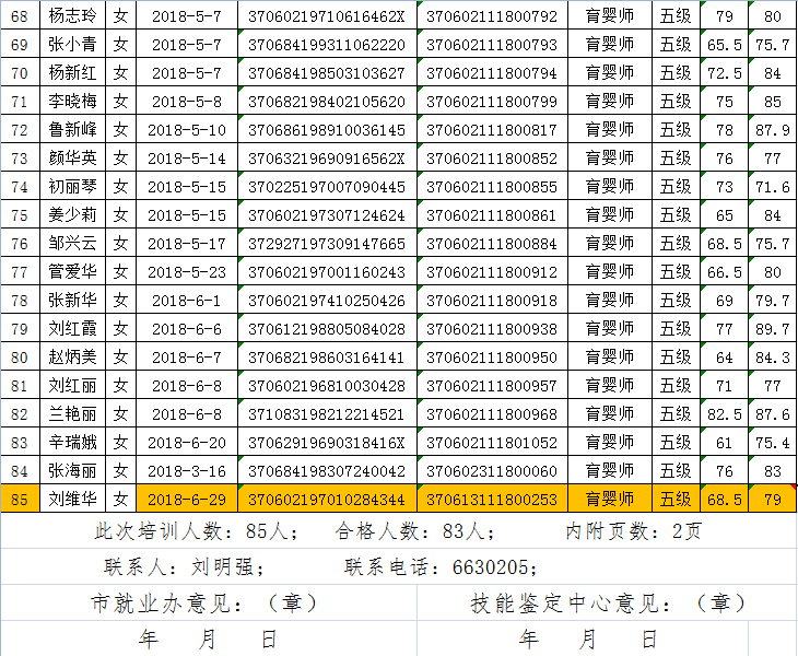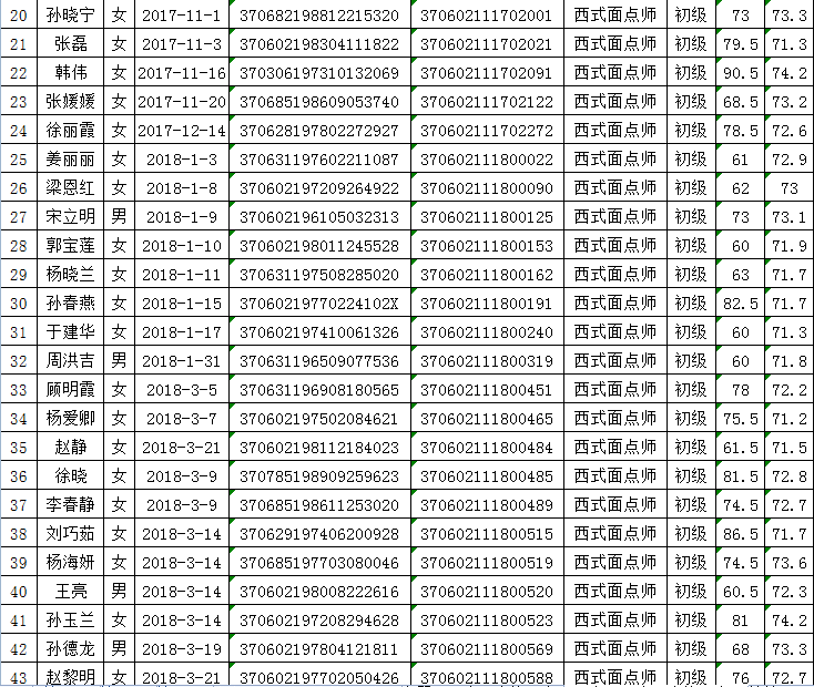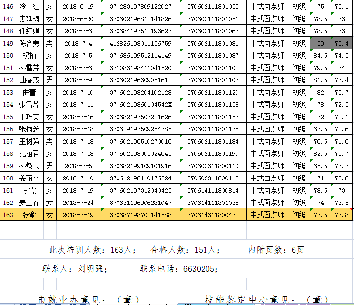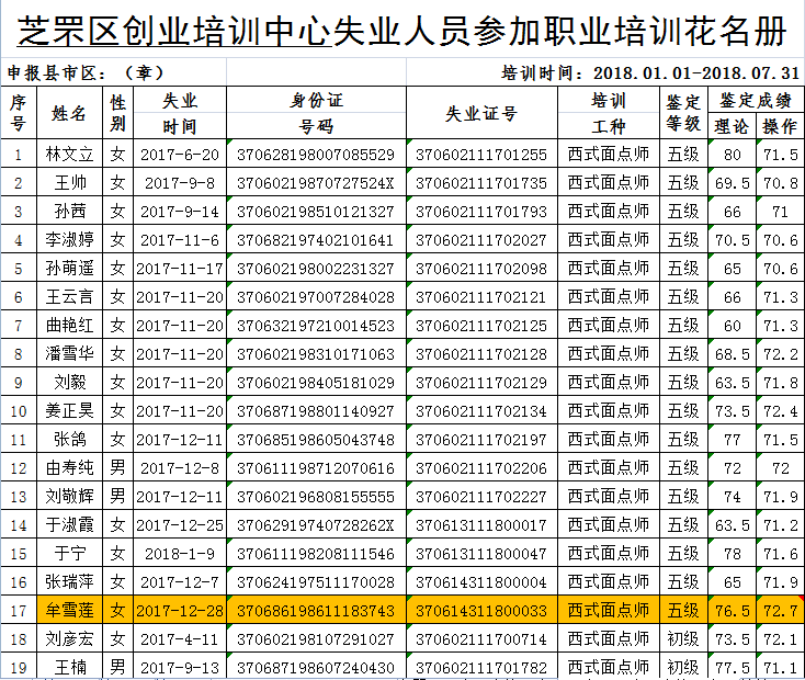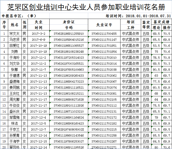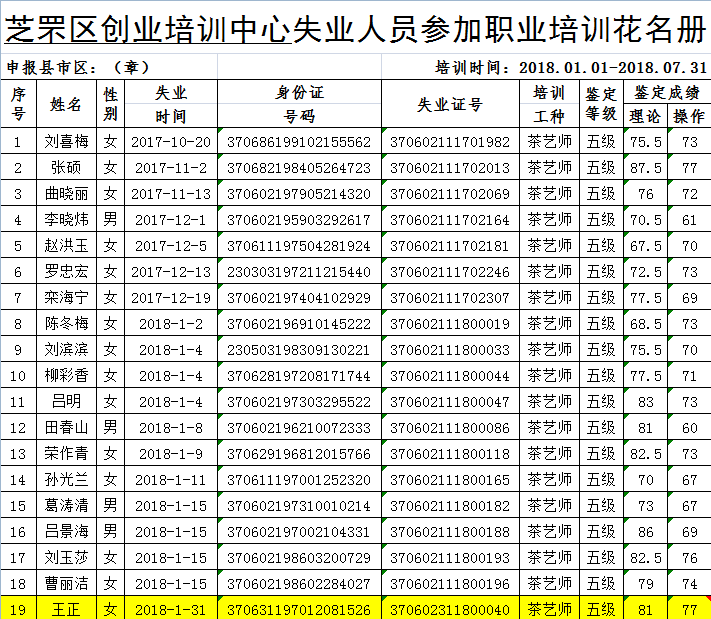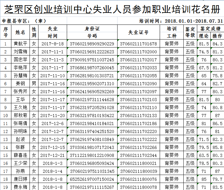 2019年度芝罘区培训补贴人员名单公示(芝罘区创业培训中心)